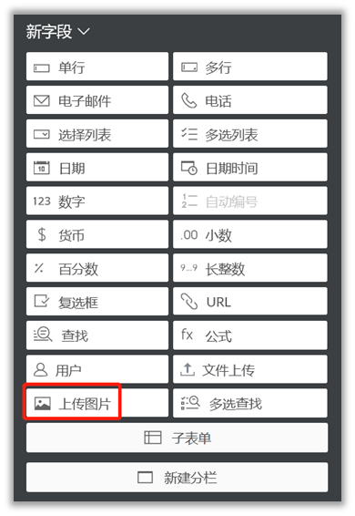 - 在 新字段 托盘中,将上传图片字段拖放至布局。
