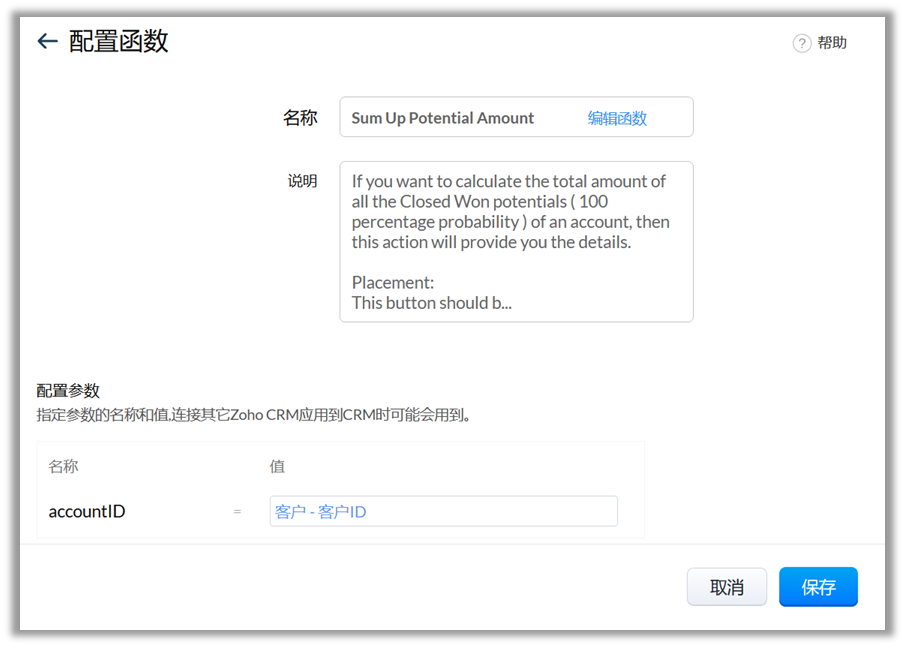 - 在 编辑参数 中,指定函数名称并将参数映射到字段名称中,或在 CRM 模块中指定自定义值。要用字段名映射,输入#选择参数值。
