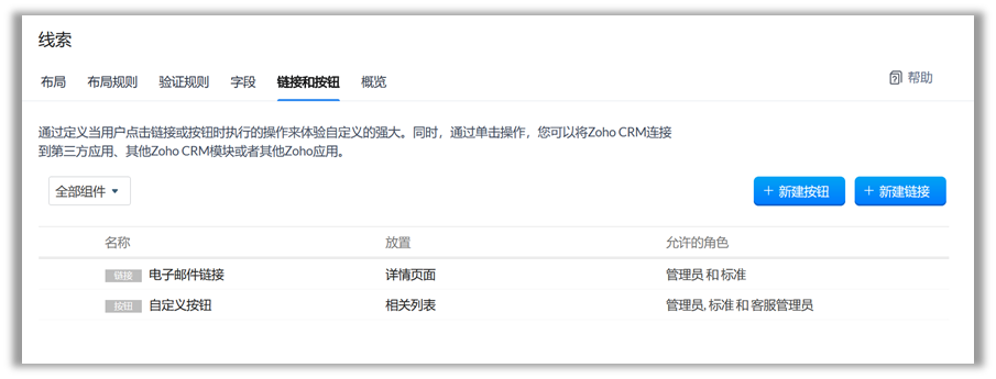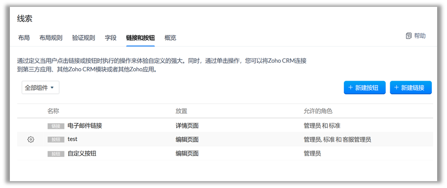 Zoho CRM 有用于执行各种预定义操作的标准按钮。 例如 转换 是用于将线索转换为联系人、客户或商机的标准按钮。 同样地,复制 也是用于复制您的 CRM 账户内任何记录的标准按钮。 CRM 管理员也可以新建按钮并根据他们的要求定义一系列操作。 Zoho CRM 中的自定义按钮可以用于将您的 CRM 与第三方应用程序连接,将不同的 Zoho CRM 模块连接在一起或与其它 Zoho 应用连接。