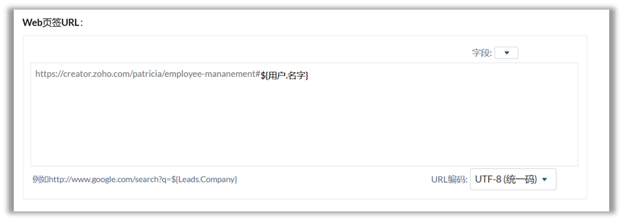 - 将显示Web页签URL。您可以根据需要添加合并字段,点击保存。