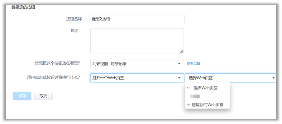 - 创建自定义按钮,并从下拉列表中选择打开Web页签作为您的按钮操作。