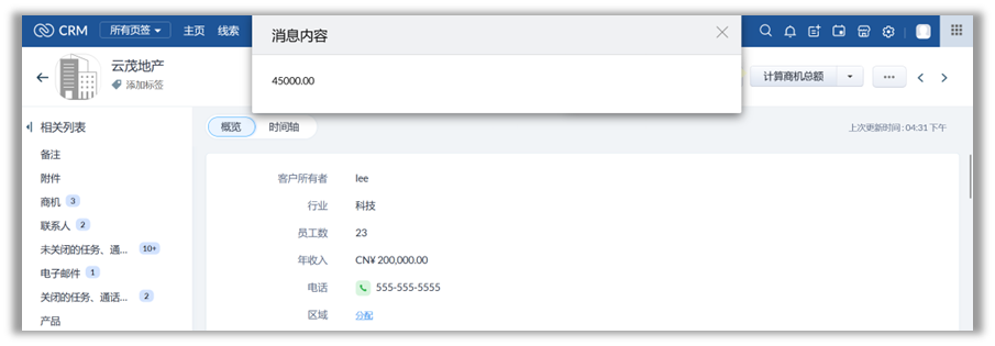 商机数量总计: 例如,一个客户关联一个或多个赢单关闭的商机,您想要计算该客户关联的赢单关闭商机总金额。