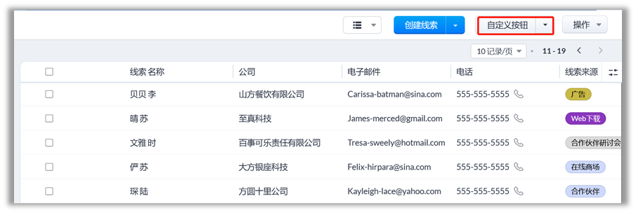 访问Zoho CRM中线索的公司信息:您账户所有的联系人都有一个字段,可以指定公司名称。 通过创建与公司关联的URL, 您点击自定义按钮即可直接转到客户公司的详细介绍(这一自定义按钮可以根据您的要求在创建、复制或查看记录时设置)。