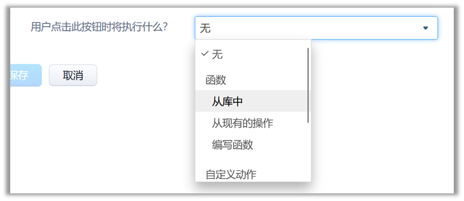 您可以选择预定义操作,也可以选择机构成员已经创建的操作。也可以通过写自定义函数来定义自己的动作,根据需要打开新网页或者调用一个URL。选择按钮要执行的操作是必须的。