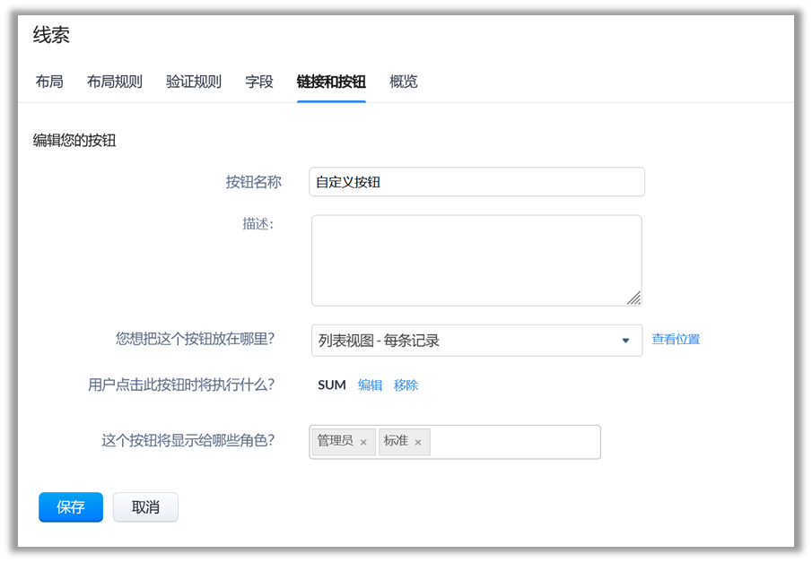 - 自定义按钮基于角色权限受到限制。 管理员可以与不同角色共享各个自定义按钮,处于相应角色中的用户才可以访问此按钮。