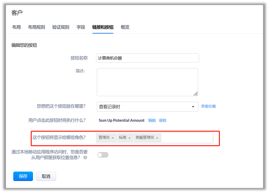 一旦自定义按钮与某个操作关联,CRM 管理员可以通过指定特定角色访问自定义按钮。