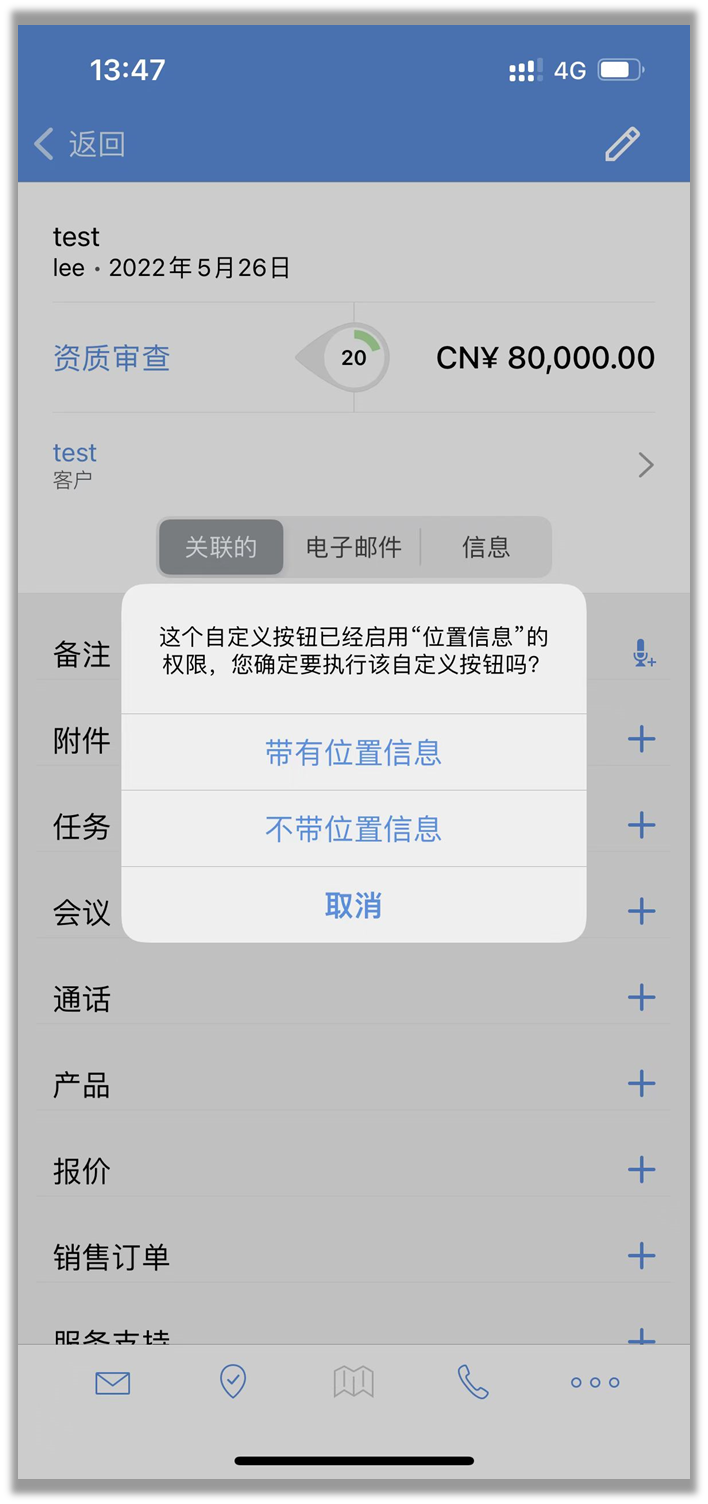 - 如果手机App用户没有开启定位服务,Zoho CRM会提醒他们在设备上开启定位服务,随后再通过自定义按钮请求同意追踪位置信息。