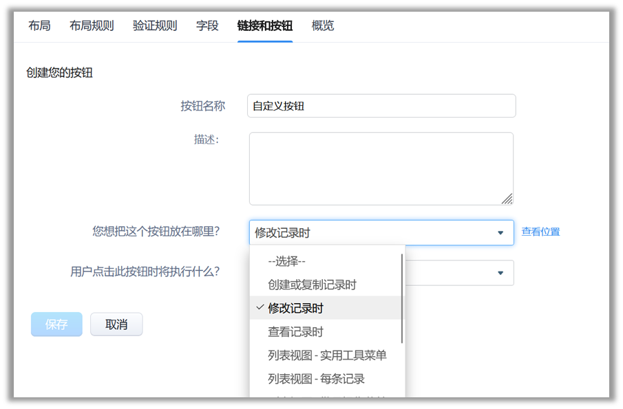 - 位置选项可出现在创建或复制记录,编辑记录,查看记录和相关列表时,但不适用于列表视图和向导。