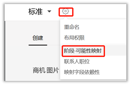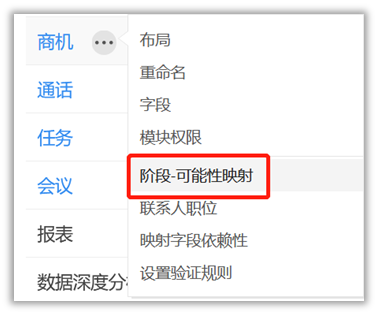 3. 点击商机模块旁边的 更多 按钮,选择阶段-可能性映射。