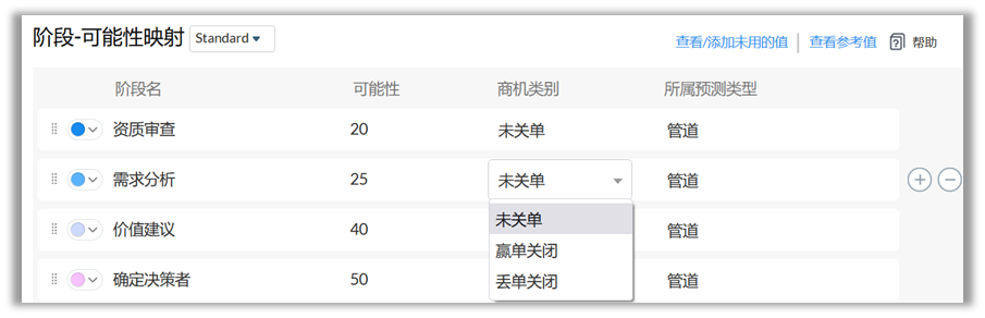 1. 从下拉列表中为每个阶段指定相应的可能性,商机类别所属预测类型。