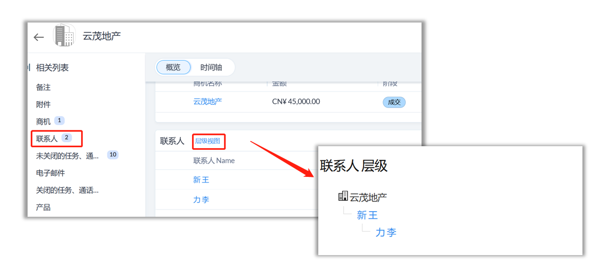“客户”模块中 - 您可从“联系人”相关列表中查看联系人层级结构。