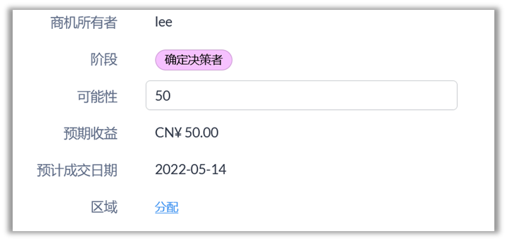 2. 可能性:将可能性关联至每个阶段,以确定成功完成交易的可能性。还可以用来根据交易金额计算交易的预期收入。