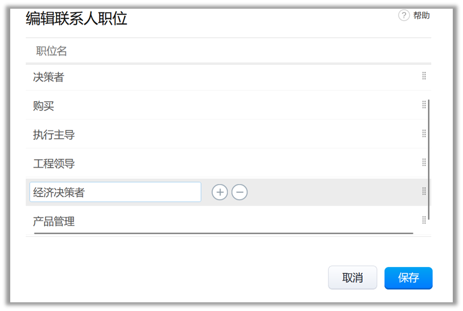 我们提供了一些联系人职位,例如,决策者、产品管理、购买和其他职位。您可根据特定业务流程定制联系人职位。