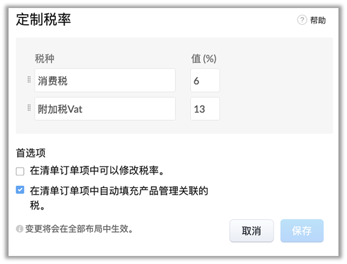 7. 在 首选项 中,选择是否希望用户修改税率或自动填写关联税率。