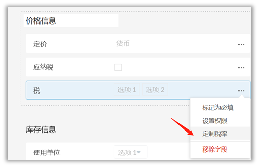 5. 点击字段上的 更多 图标,然后选择定制税率选项。