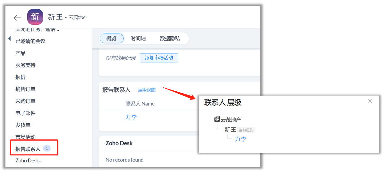 “联系人”模块中 - 系统会创建名为“报告联系人”的相关列表,其中显示联系人的直接报告和报告层级结构。