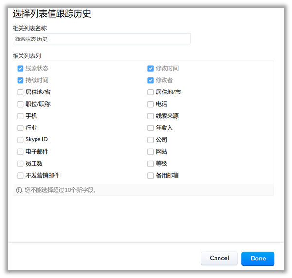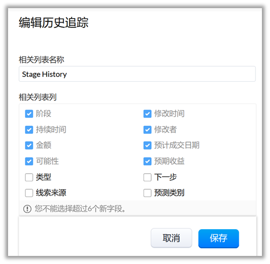 通过编辑历史追踪记录,您不能选择超过6个字段。