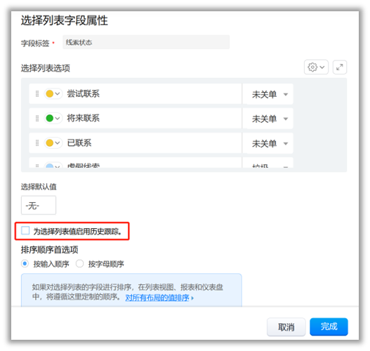 - 在 选择列表属性 页面中,勾选为选择列表值启用历史跟踪。