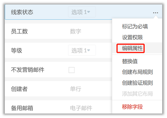 - 在 布局编辑器 中,转至所需的选择列表字段,点击 设置 图标并选择编辑属性。