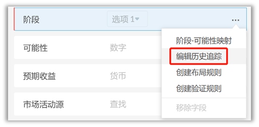 “商机”模块在记录的相关列表中显示默认阶段历史记录。您可通过在布局中点击“编辑历史记录跟踪”选项以向现有阶段历史记录添加其他列。您可选择“阶段”字段并点击“更多”图标来找到此选项。