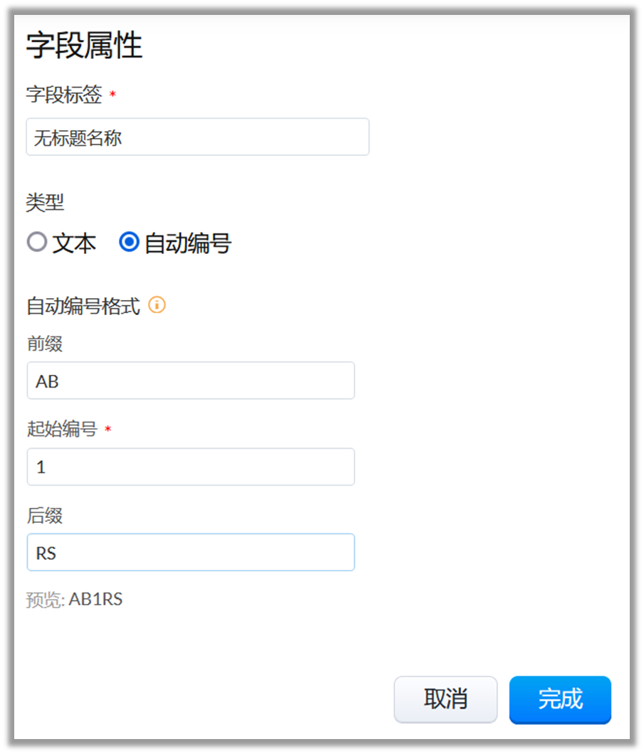 - 对于自定义模块的 名称 字段,用户可在以下两种字段类型中进行选择:文本和自动编号。选择后,不能更改默认 名称 字段类型。
