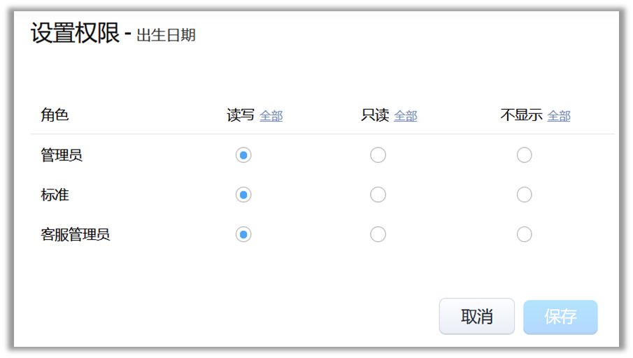 - 设置字段访问权限:可隐藏特定角色中有关用户的字段,或将这些字段标记为“只读”。