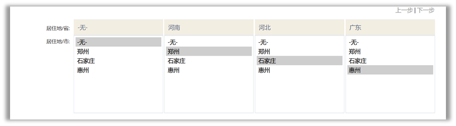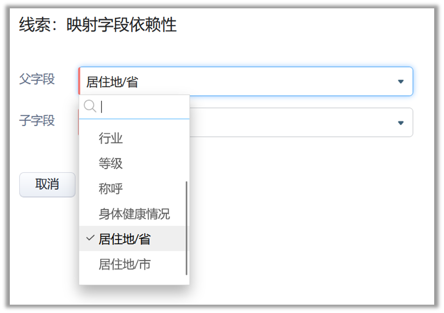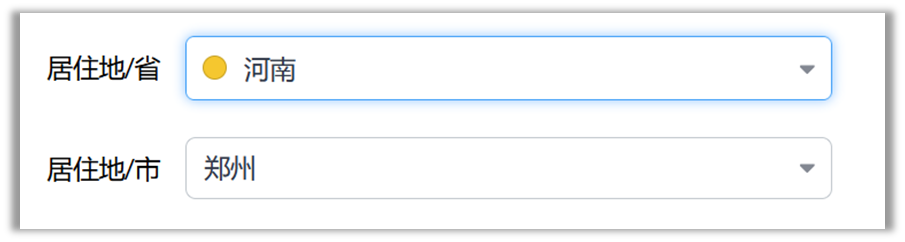 - 例如,如果父字段为居住地/省,然后对所选分支选择相应居住地/市 。