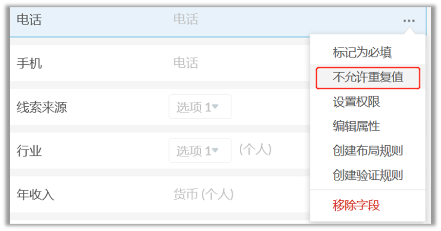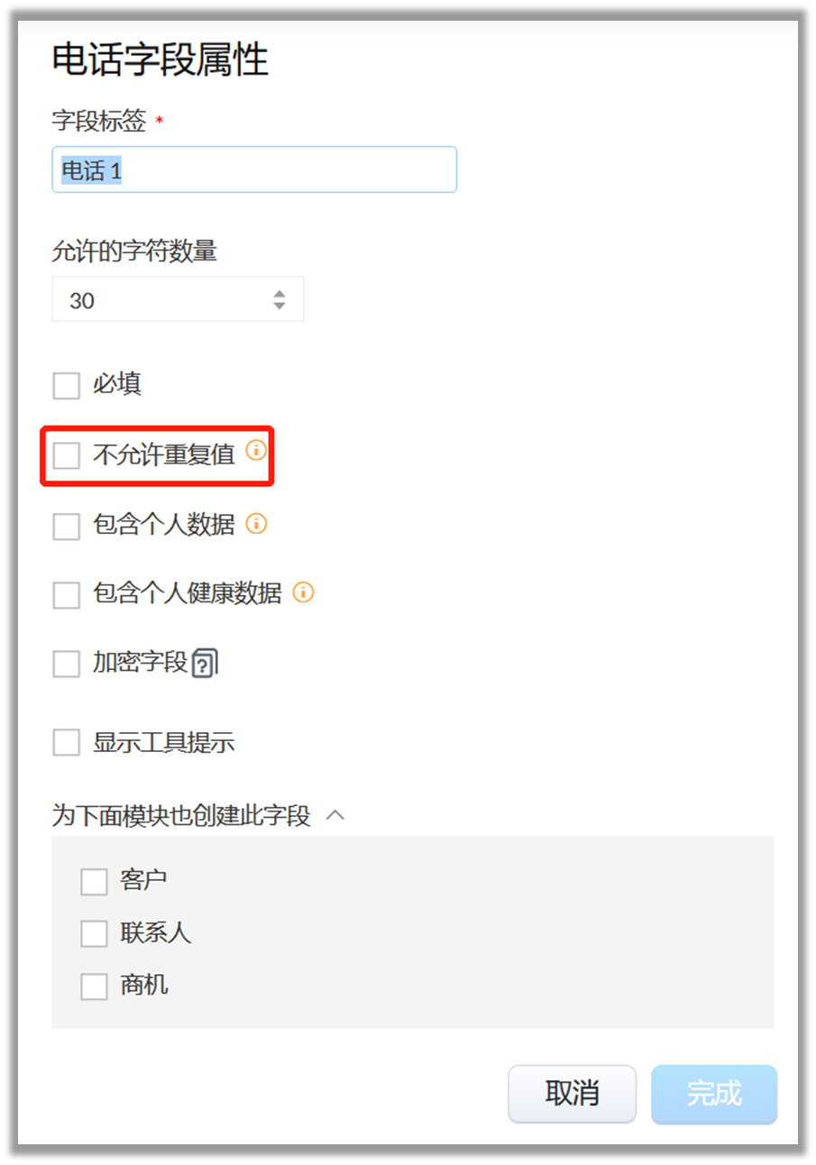 - 在所有模块中,只有“文本”、“电子邮件”、“电话”、“整数”、“长整数”、“URL”字段才能标记为唯一字段。