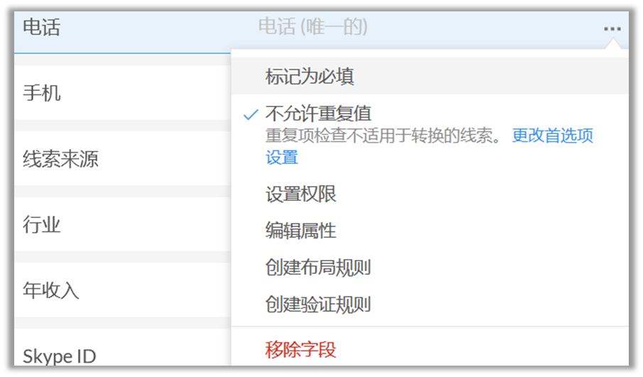 - 通过 CRM 迁移、MS Outlook 和 Google 同步创建的或从“回收站”恢复的记录不支持唯一字段。