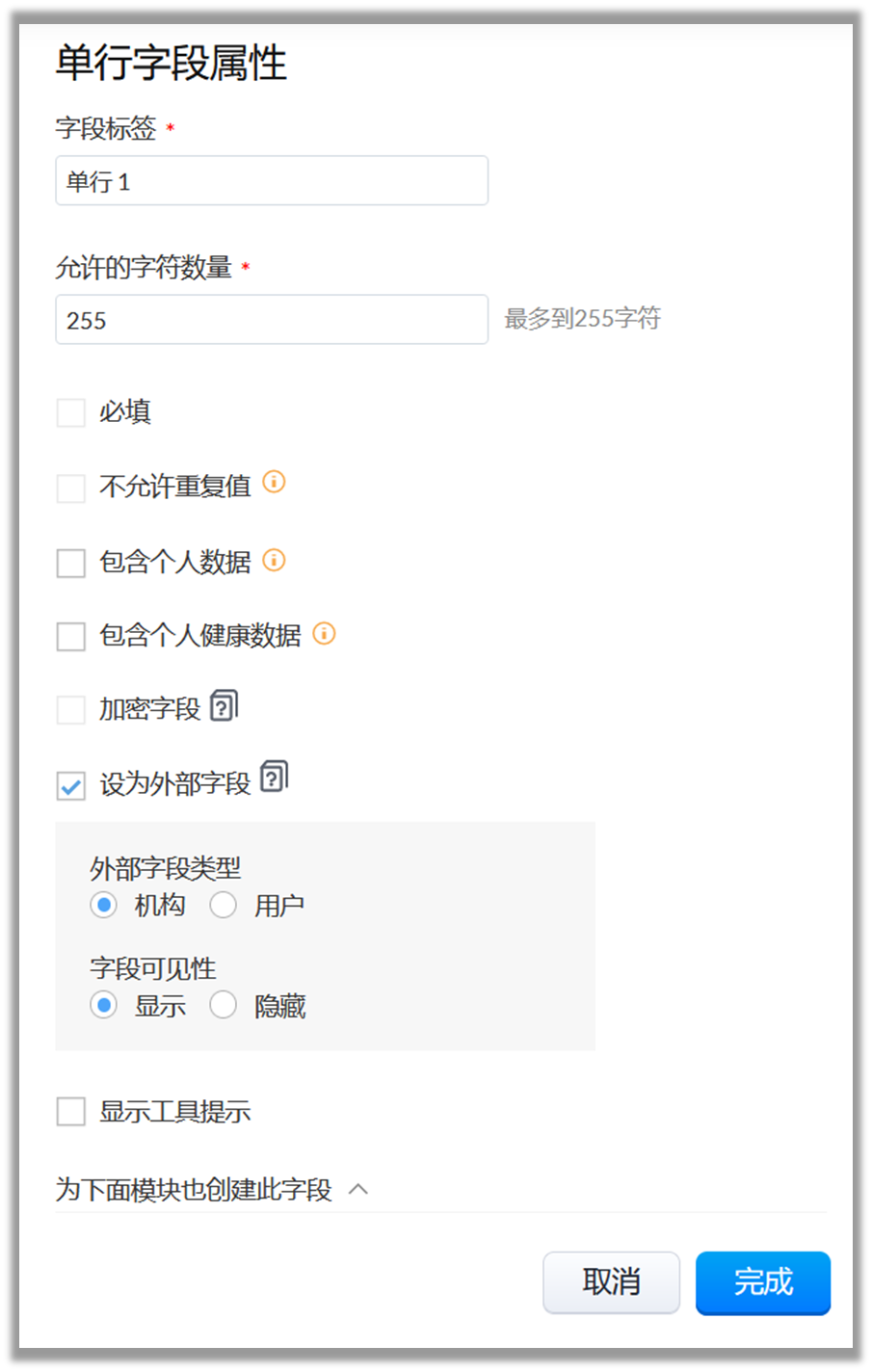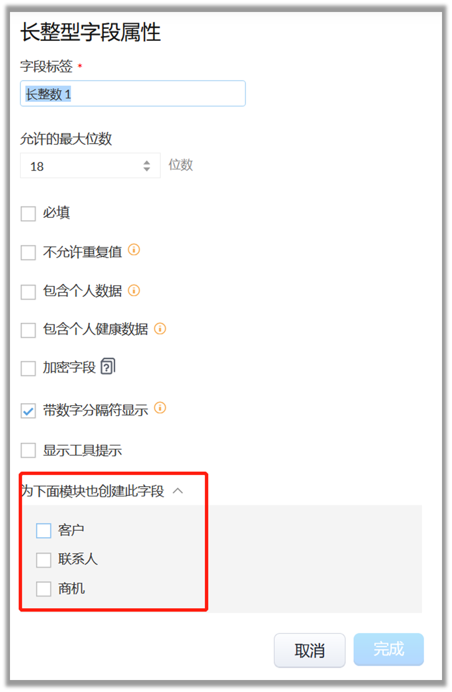 - 为“客户”、“联系人”和“商机”模块也创建此字段选项仅在为“线索”模块创建字段时可用。