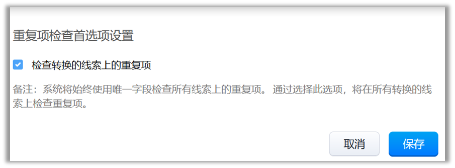 要启用 针对已转化线索的重复检查,请点击更改首选项设置链接,此链接将在您将字段标记为唯一时显示。在“重复检查首选项”弹出窗口中,选中检查转换的线索中的重复项复选框,然后点击保存。您可不断更改此设置。