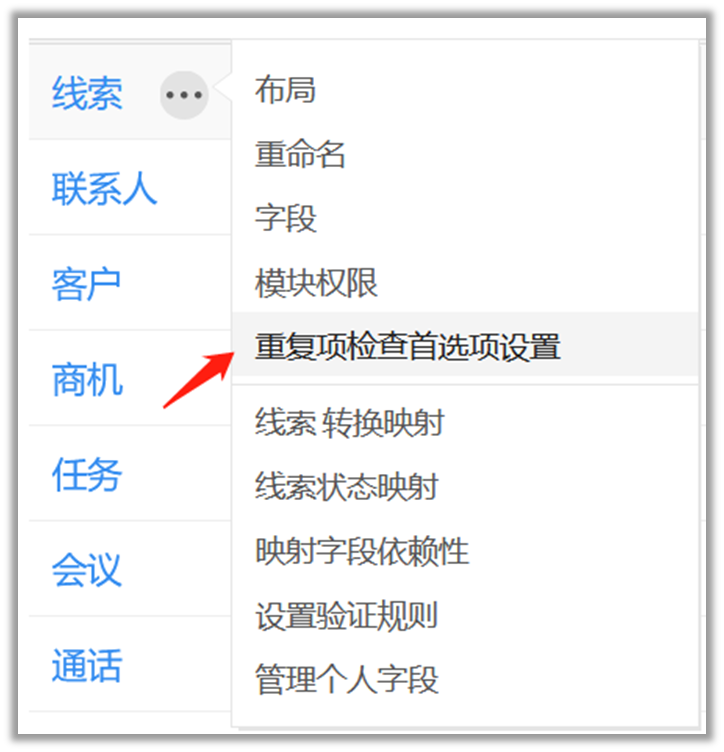 还可从设置 > 定制 > 模块 > 线索中启用重复检查。点击 更多 图标,选择重复项检查首选项设置。