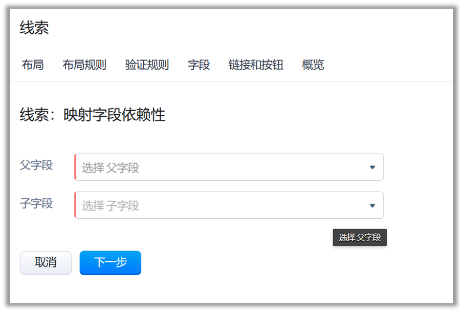 注意: 父字段和子字段将显示布局和子表单中所有的选择列表。