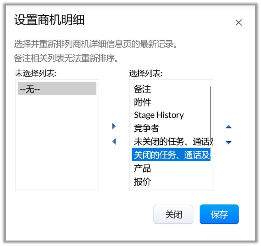更改每个模块中记录相关列表(如附件、打开活动、关闭活动等)的顺序。根据组织的业务需求显示或隐藏一些相关列表。另外,定制相关列表,以便只查看所需的详细信息。