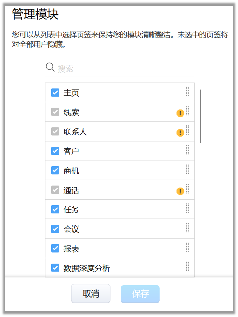 根据您的使用和偏好,通过拖放来重新排列模块。隐藏不愿看到的模块,未选择的页签将对所有用户隐藏。