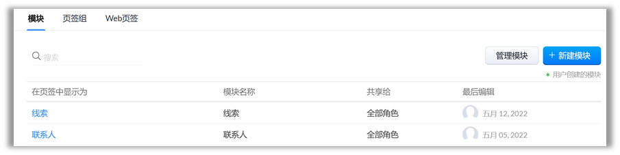 角色中具有“模块自定义”权限的用户可以访问此功能。对于具有管理员角色的用户,系统默认启用此权限。