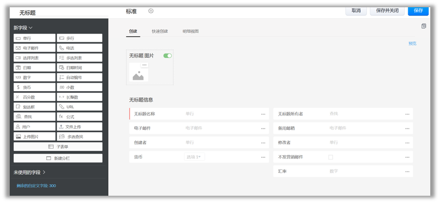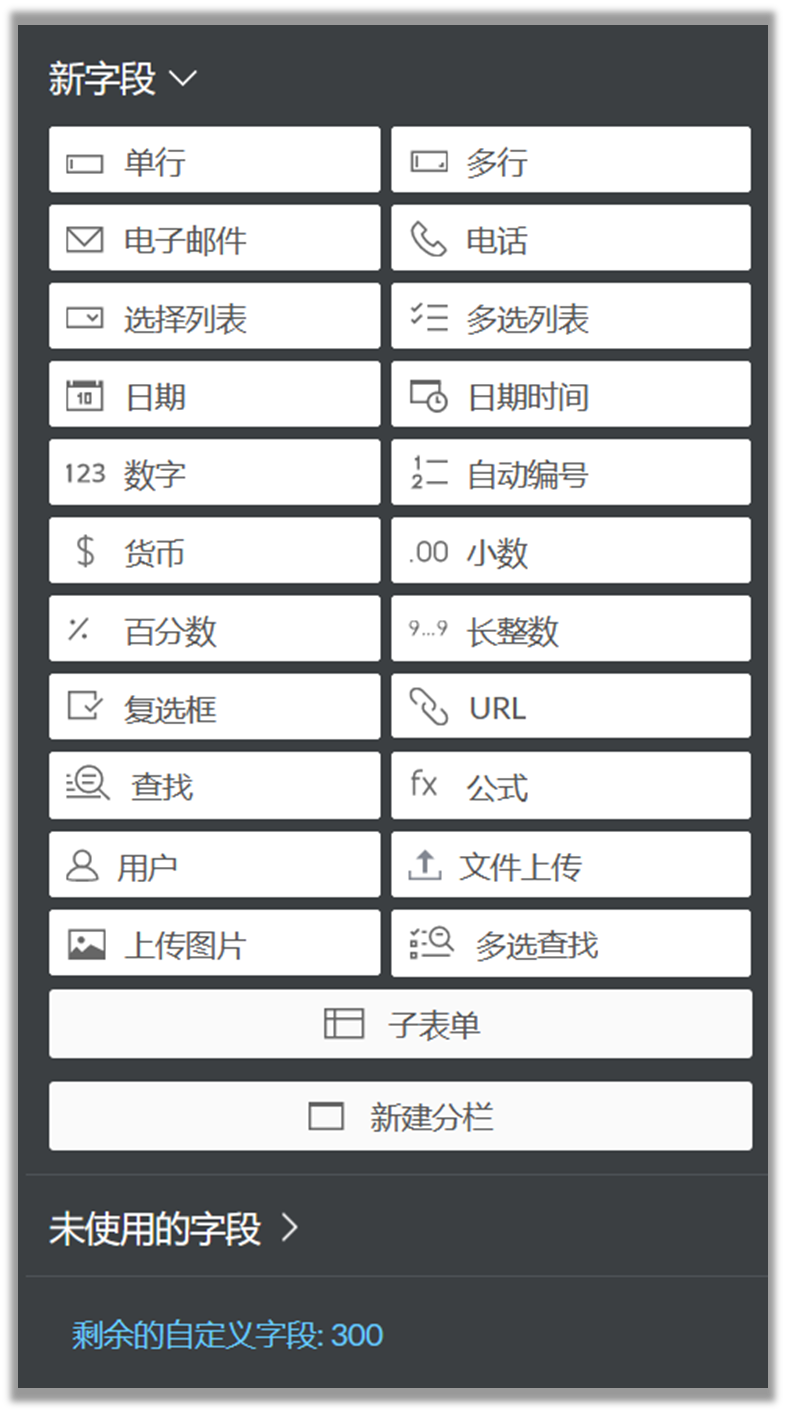 当您添加新字段和删除现有字段时,系统将自动计算出剩余的自定义字段数,根据您所使用版本的字段限制,您还可以创建多少个字段。
