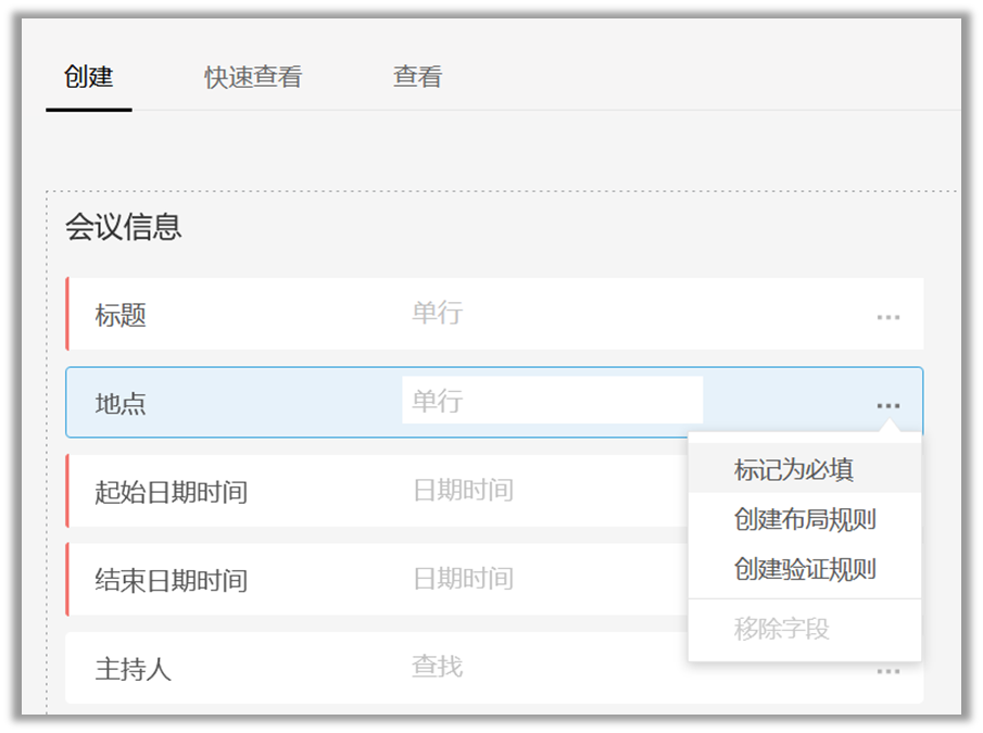 - 您可以在快速创建和详细信息视图中添加特定于布局的字段。