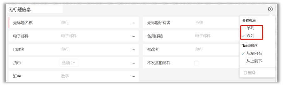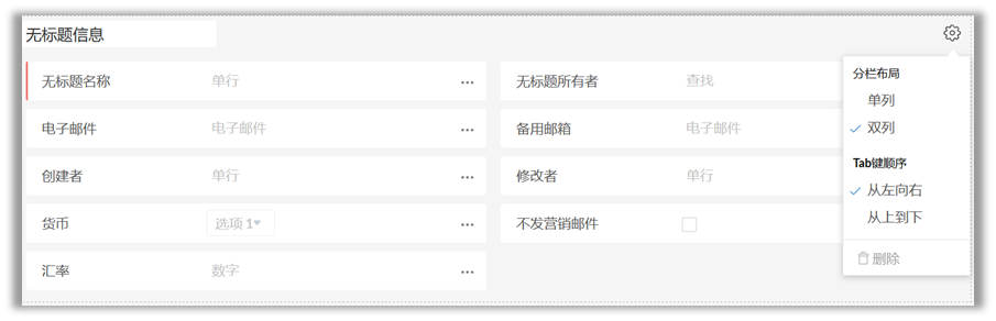 可以通过修改布局来改变模块的外观和感觉。通过重新安排字段和分栏,改变布局设置,使表单字段看起来更有条理。例如,您的定制模块“新房产”用来管理房产线索,您可以为“公寓详情”分栏设计一个由所需字段组成的布局。布局决定了所在界面的结构。您可以选择单列布局和双列布局。