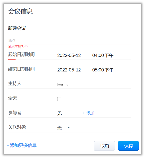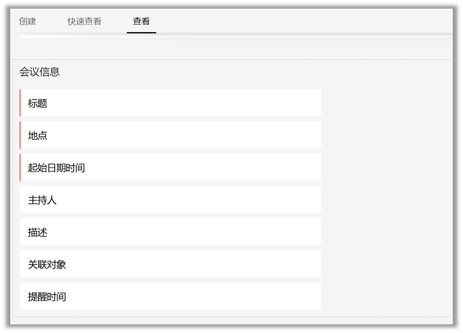 会议页面布局与其他模块的页面布局不同,但您仍然可以添加或移除字段、重新排列字段,并将其标记为必填字段。以下三个链接提供用于编辑活动布局相关详情的选项: