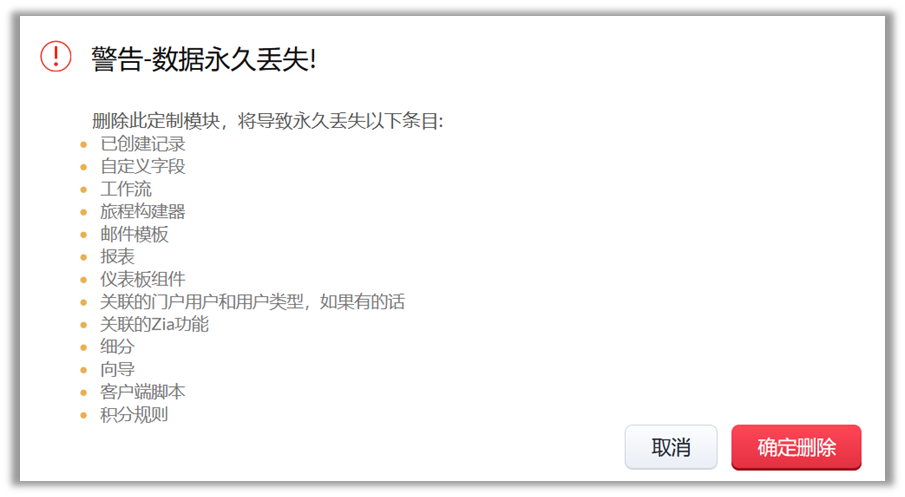 在 Zoho CRM 中,不能删除标准模块,但是,如果需要删除定制模块,请确保该模块未链接至另一模块。删除定制模块后,不能恢复其中数据。删除之前,确保您已经检查以下各项内容: