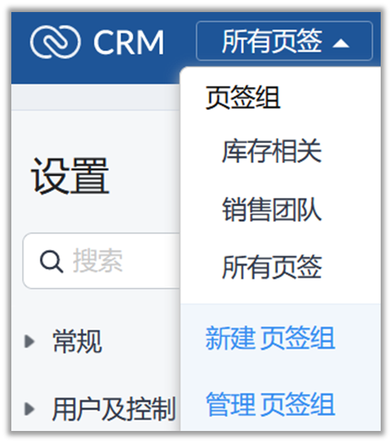例如,销售组可能只使用线索、联系人、客户、商机、报表和数据深度分析(仪表板)模块。因此,您可以创建一个销售页签组,并仅为销售角色提供访问权限。请注意,用户将基于其角色中的模块级权限访问页签组中的模块。