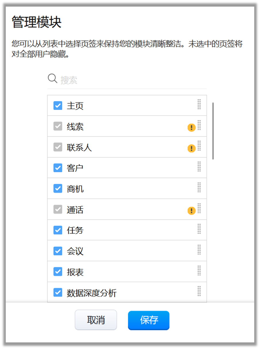 管理模块允许企业只显示跟自身业务相关的模块,并隐藏不需要的模块。例如,使用Zoho CRM的教育机构可能不需要报价单或发货单,那么就可以把这些模块隐藏掉。您还可以通过在列表中向上或向下移动模块来更改它们的顺序。