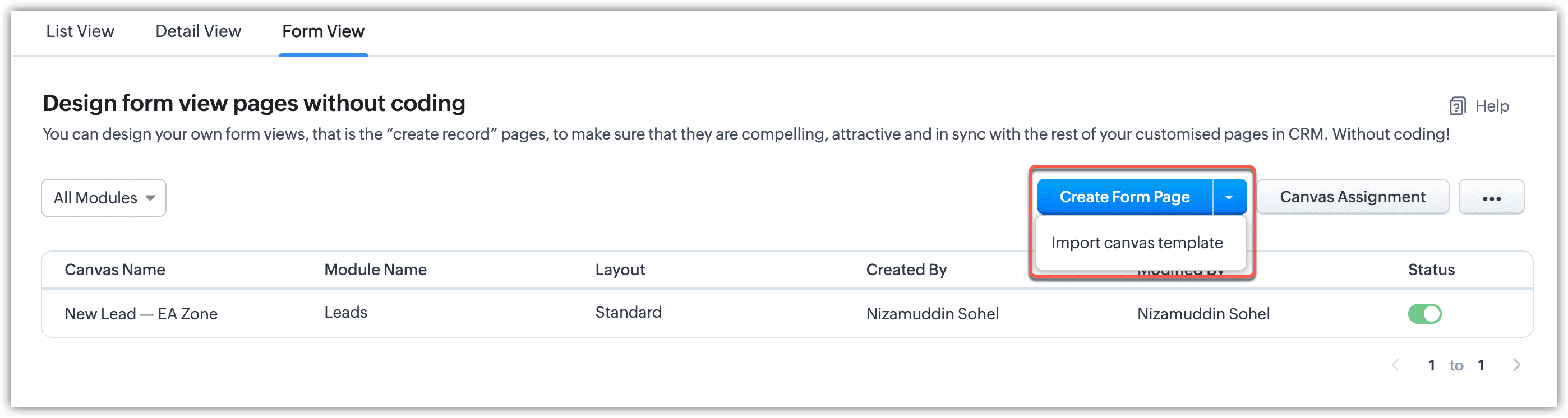 在“表单视图”中,单击“创建表单页面”,或单击“导入画布模板”。