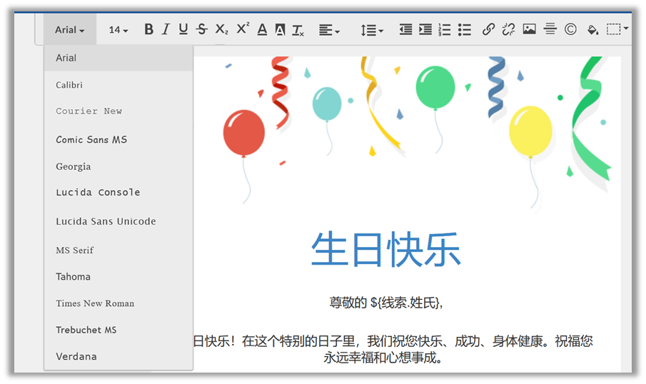 您可以为所有电子邮件模板选择字体。选择字体仅可用于 文本 和 图像 + 文本  组件。您可以从下拉列表中选择字体。