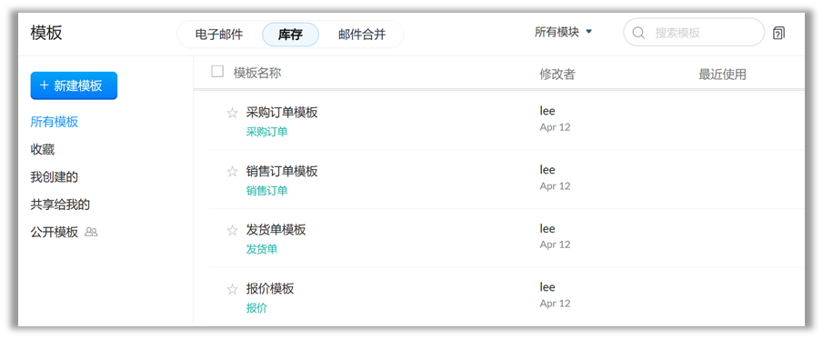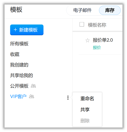 - 库存模板中提供默认文件夹,例如所有模板、收藏、我创建的和共享给我的。