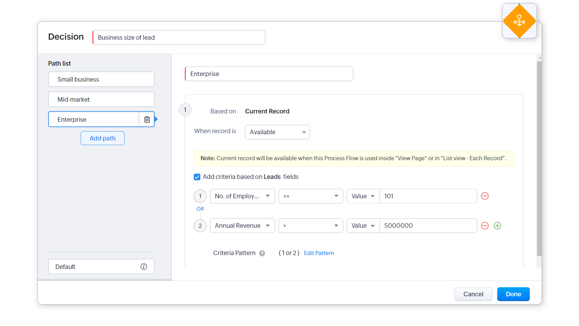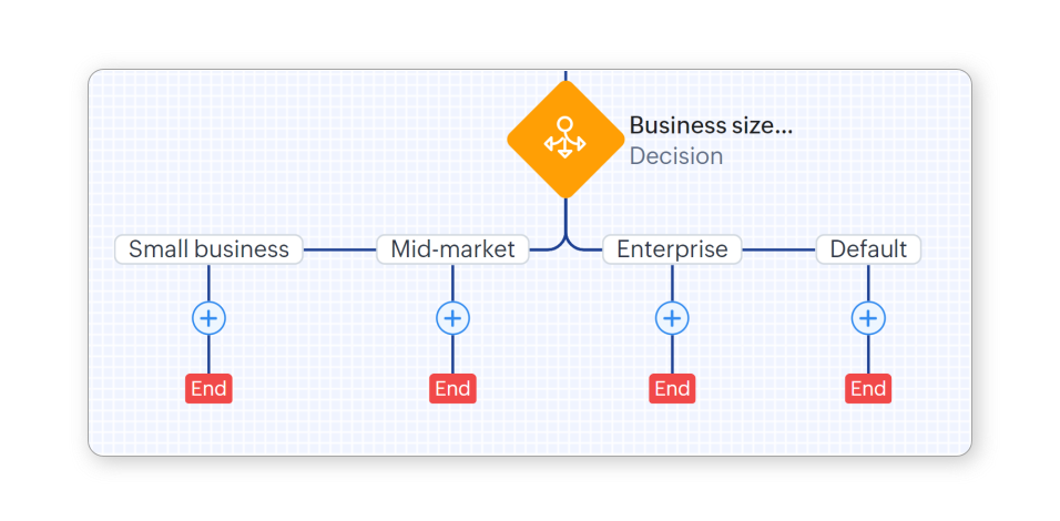 决策组件用于根据现有 CRM 数据或先前屏幕字段中的数据在交互信息界面构建器流程中创建分支。它与屏幕上的按钮相对应。两者都规定了要执行的流程分支,但决策组件会根据数据自动执行操作。您需要指定一个条件来决定流程分支。系统会有一个默认路径,以防其他路径的条件不满足导致流程无法退出。