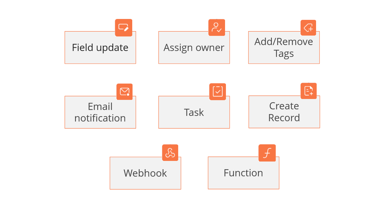 可用的操作包括字段更新、分配所有者、添加标签、邮件通知、添加任务、创建记录以及执行 Webhooks 或自定义函数。