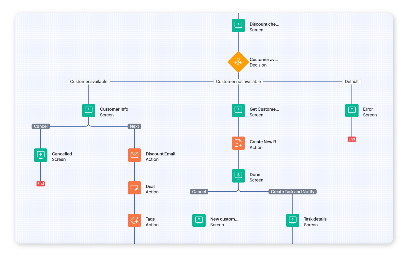 操作至关重要,因为它们将屏幕中的数据与 CRM 的其余部分连接起来。如果用户流程到该分支,则分支中的操作将自动执行。创建操作时您可以利用在前面屏幕中收集到的数据。例如,用户在前面的屏幕中输入的详细信息可以用作函数参数值。