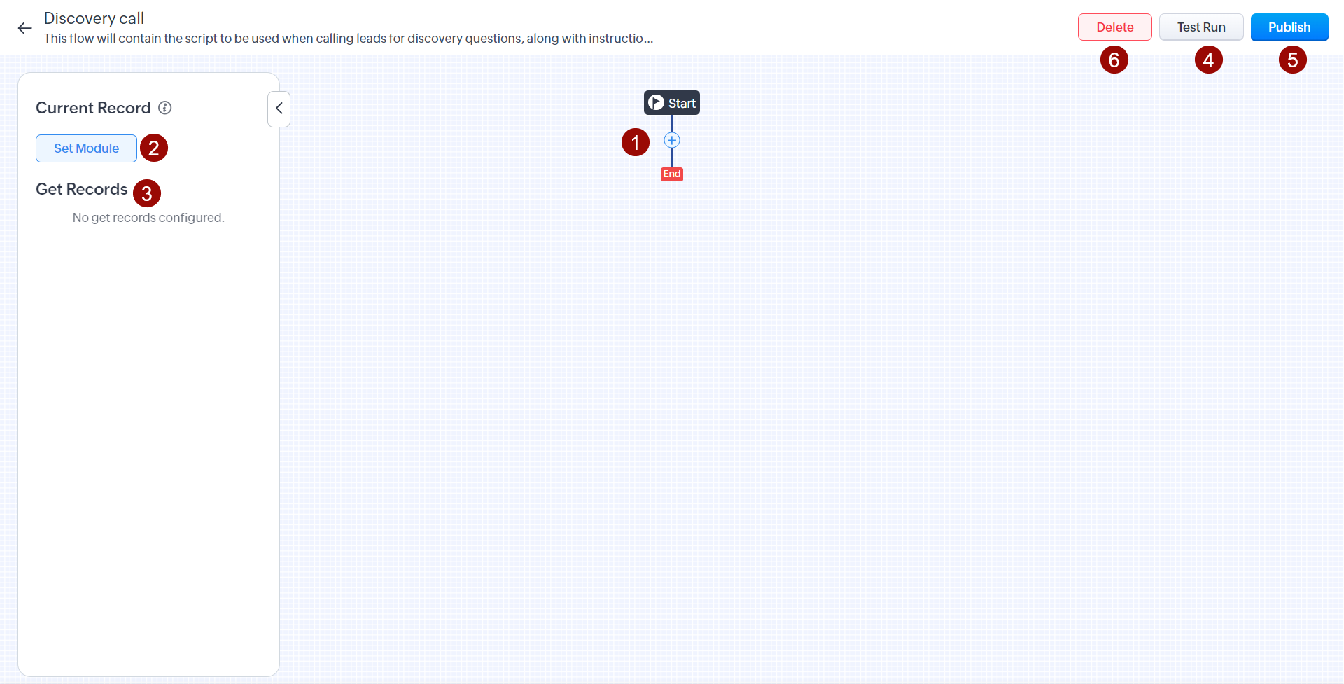 - 单击 + 添加元素(屏幕、决策、操作)并开始配置它。